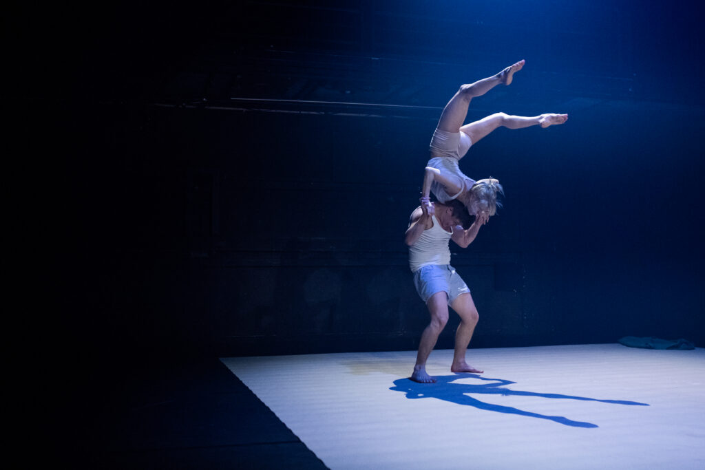 In the first part of the performance, the two performers move in an acrobatic dance across the stage. They climb and throw each other around as easily as if they were nothing more than a sack of feathers, but most of all, they trust each other. It is clear that both know the other's movements like the back of their hand. They represent a world of balance, cooperation and trust. Their acrobatic movements show how soft Riia Kivimäki is, and her movements are therefore often “bridge-based”. Her flexibility can be compared to a contortionist, but the performance is packaged in a completely different way than a regular contortionist act. A traditional contortionist act often contains stylized poses that emphasize their mobility. Such as standing on their hands and stretching their legs over their head or lying on their stomach and bending their legs so that their feet can be placed on either side of their face. Instead of these stylized poses, in GLG they are packaged in continuous movements that slide into each other.