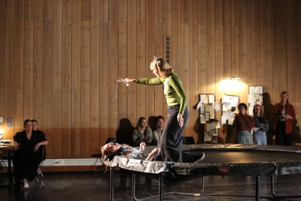 Midt i rommet sto en trampoline, en køyeseng og en sofa. Scenografien symboliserte livsfasene til de seks utøverne vi følger fra barn til alderdom. Tre generasjoner skuespillere; barn, unge voksne og eldre kvinner, spilte samme vennepar gjennom et helt liv. Når lyset i hallen var tent kunne publikum utforske rommet fritt, men når det ble dempet, inntok skuespillerne scenen og spilte ut små hverdagslige tablåer. Disse knyttet seg ofte til møblene i rommet. I én av scenene observerte vi for eksempel to små jenter som lekte gjemsel rundt en trampoline.