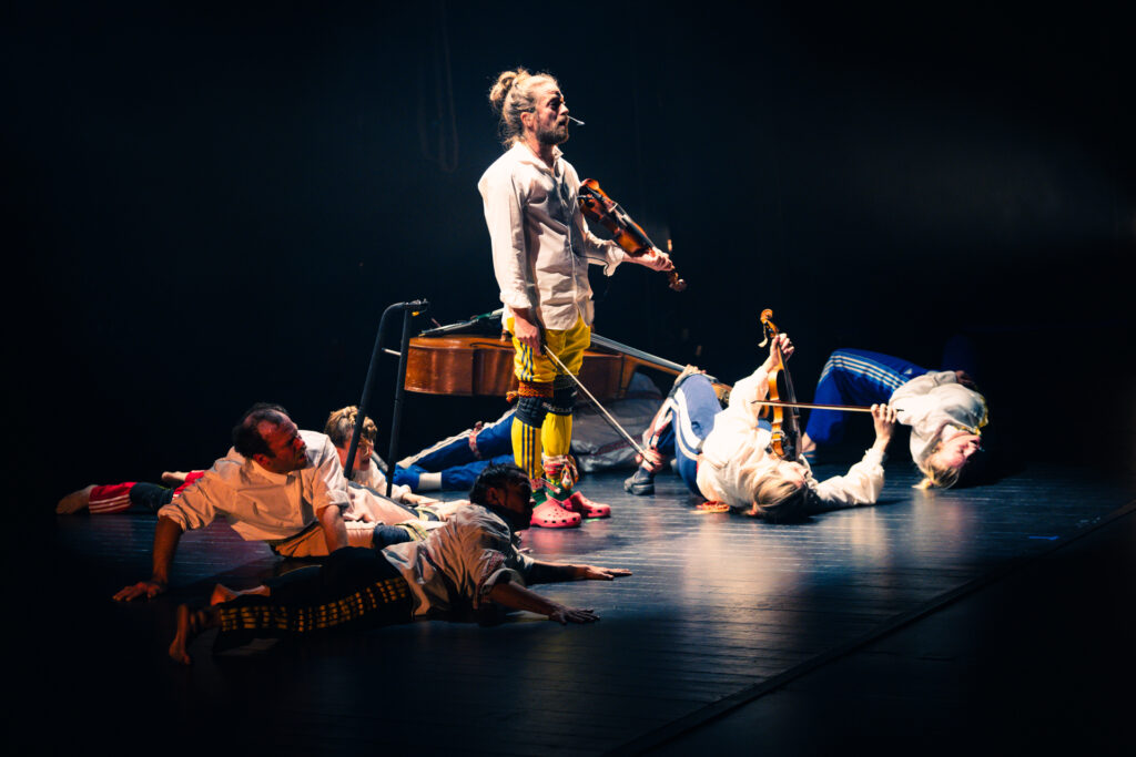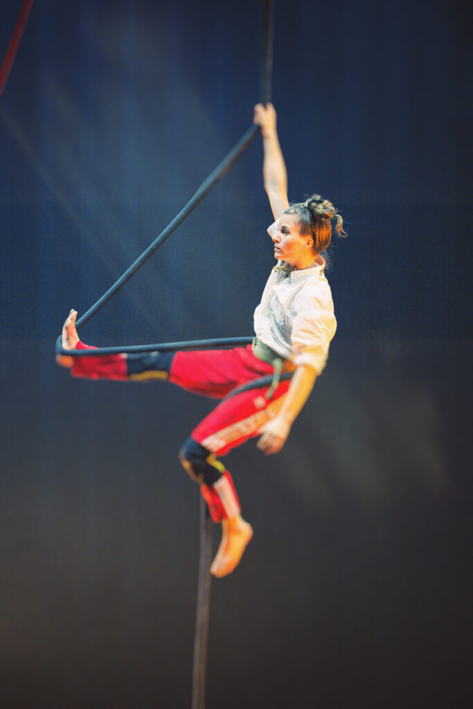 Et annet eksempel på dette er når en av utøverne klatrer opp på kontrabassen, som så blir løftet opp av de andre, mens utøveren står oppå. Deretter blir den hengt opp i to stropper fra taket. Mens musikeren så spiller på instrumentet danser utøveren på toppen av den. Det hele blir en fin sammenslåing av sirkus og musikk. Kanskje det er nettopp dette sirkus dreier seg om: Å uredd blande elementer og tøye kreativiteten til det ytterste.