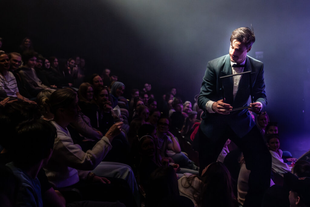 Viggo Venn leder showet, Viggo Venneløs, og reiser rundt til forskjellige videregående skoler og setter opp forestillingen samarbeid med Den kulturelle skolesekken. Dette er et perspektiv fra forestillingen han holdt på St. Hallvard.